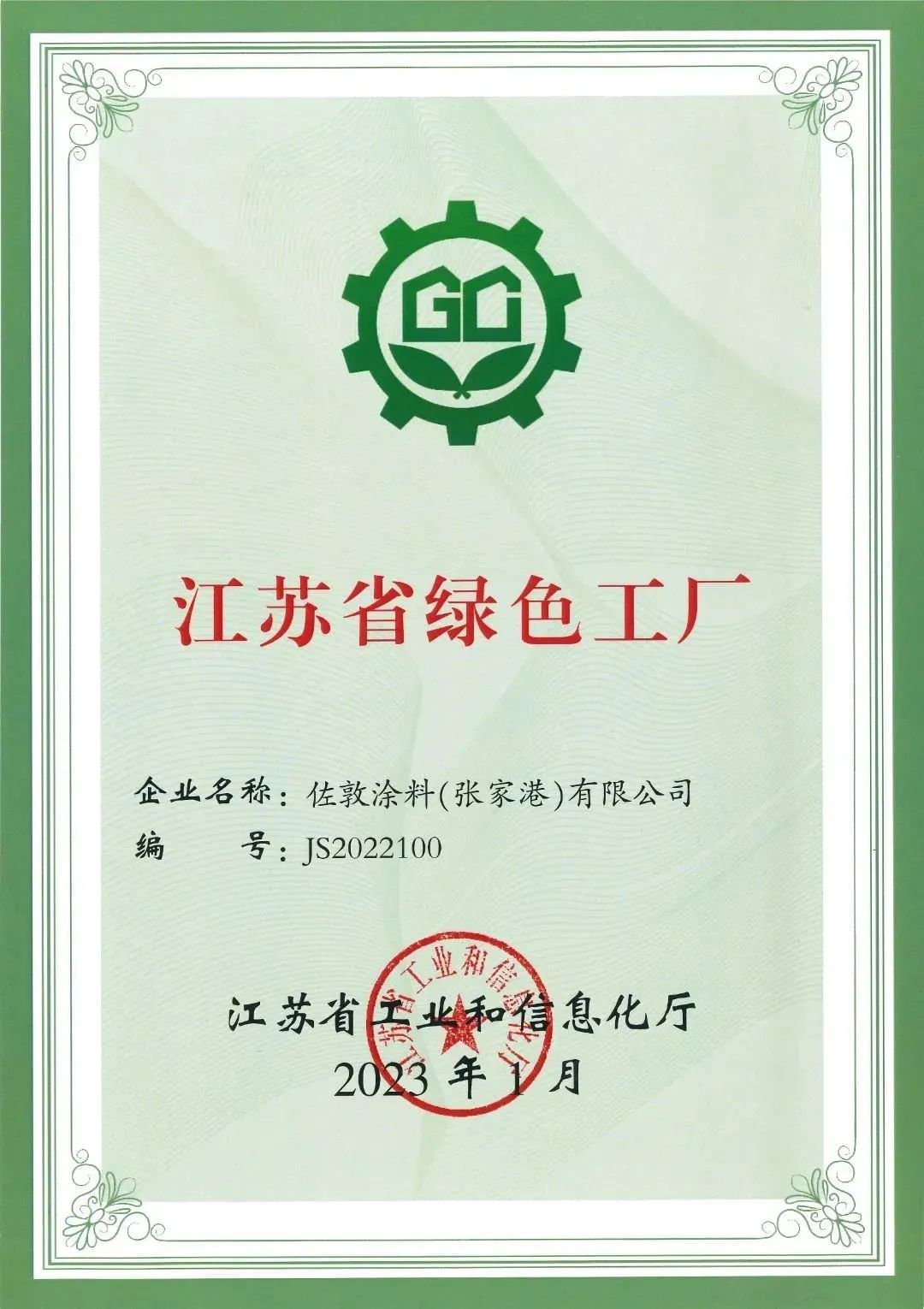正式被評為“江蘇省綠色工廠”